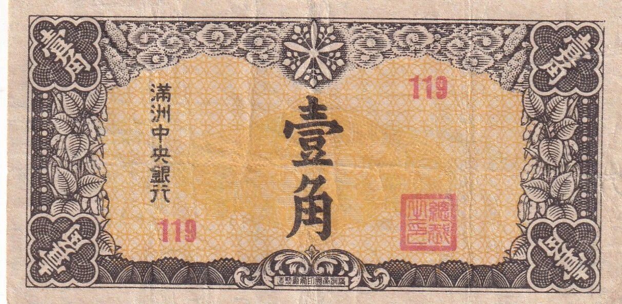 This banknote is a 1 Chiao, issued in 1944, from Manchukuo. It is part of Series 119. It is a numismatic specimen of interest to collectors and enthusiasts of monetary history.