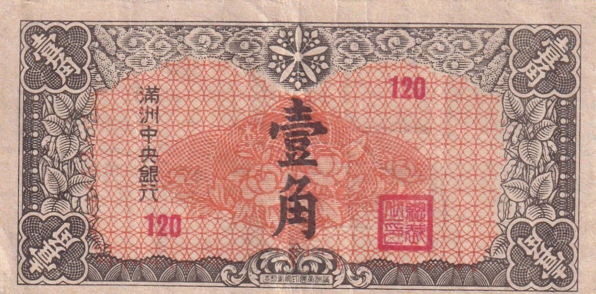 This banknote is a 1 Chiao, issued in 1944 by Manchukuo. It is part of Series 120.