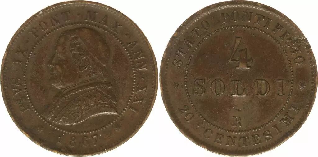 Portrait du pape Pie IX (1792-1878) avec la légende en latin "Pontifex Maximus" (Souverain Pontife) et l'année du pontificat