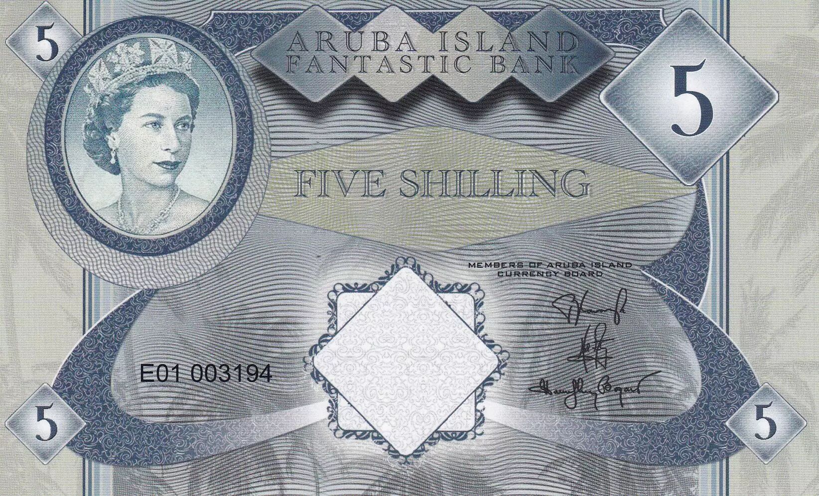 Banknote 5 Shilling - Aruba Island Fantastic Bank - Elizabeth II - Greater flamingo, beach