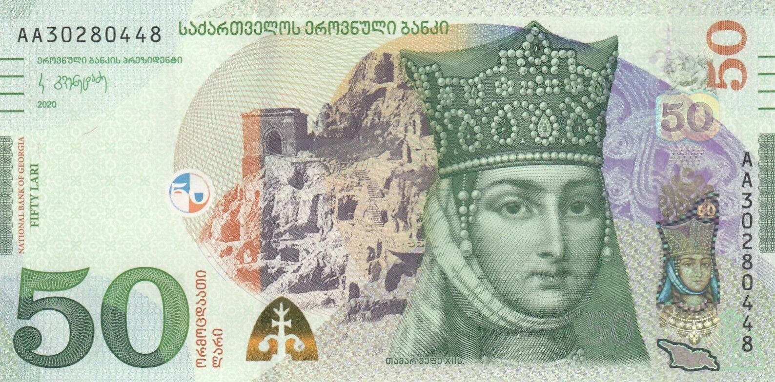 The 50 Georgian Lari banknote, issued in 2020, is part of the AA series and pays tribute to Queen Tamar. It is a commemorative note that incorporates distinctive elements related to the sovereign and astrological symbols.