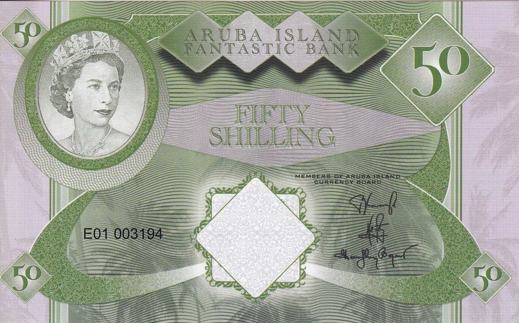Banknote 50 Shilling - Aruba Island Fantastic Bank - Elizabeth II - Dolphins, beach
