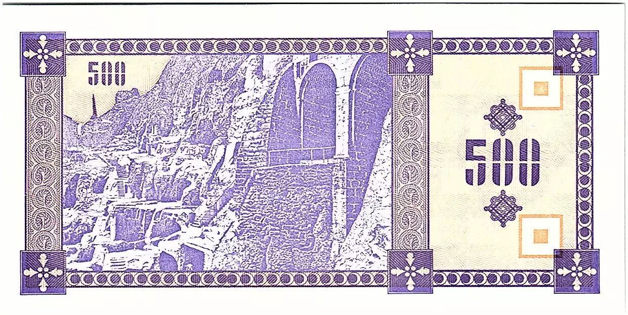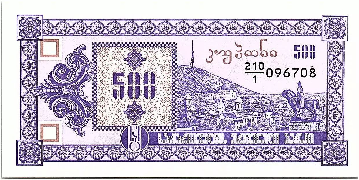 The 500 kuponi banknote, issued in 1993, represents a denomination of the transitional currency used in Georgia in the early 1990s, during the post-Soviet period. This banknote is part of a specific series, ranging from 210 to 221.