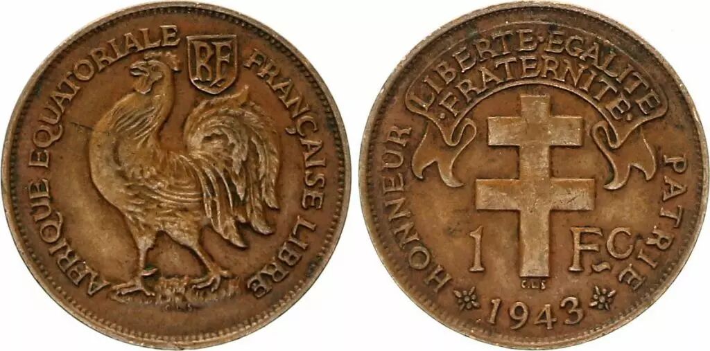 Pièce AEF 1 Franc Croix de Lorraine - Coq - 1943