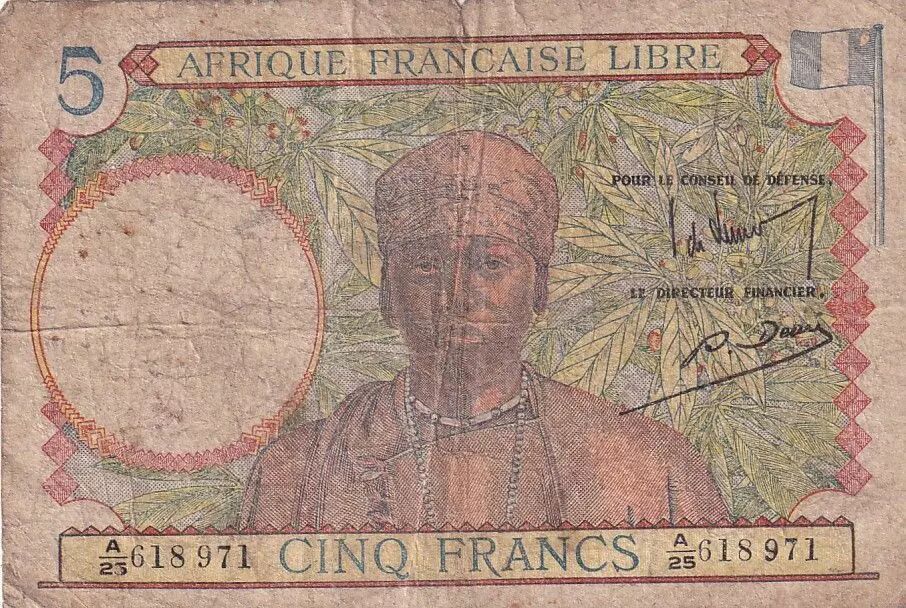 Home > > AEF 5 Francs - Afrique Française Libre - 1941 - Serial A 25