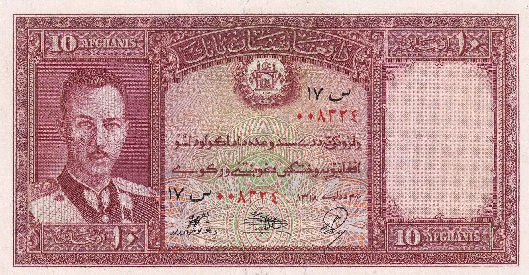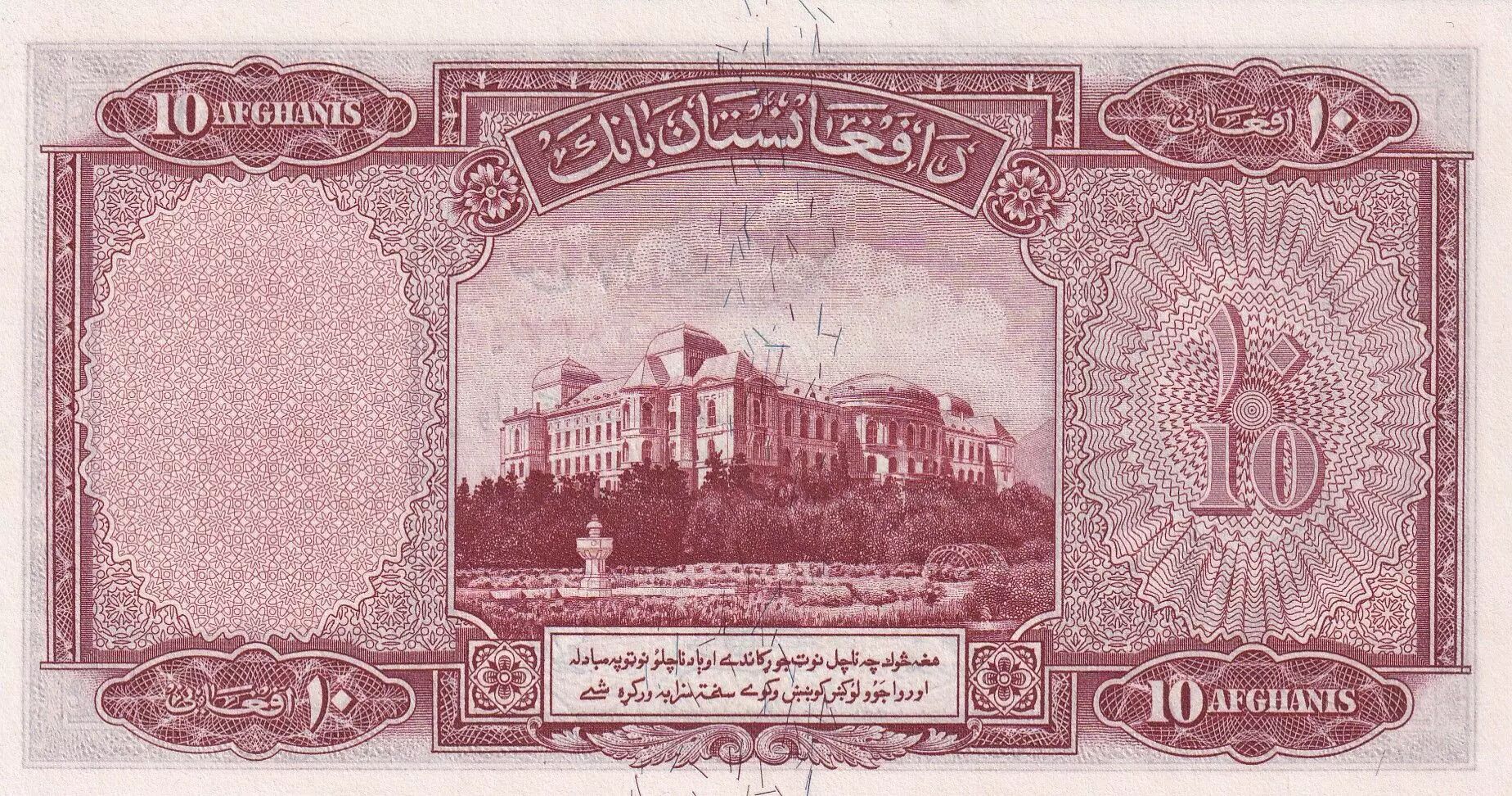 Banknote Afghanistan 10 Afghanis - King Muhammad Zahir - Dar-al-Aman Palace in Kaboul - 1939