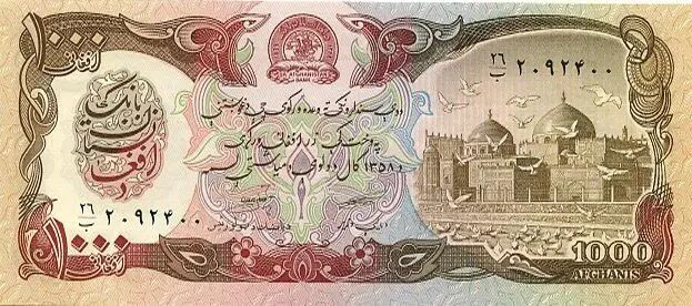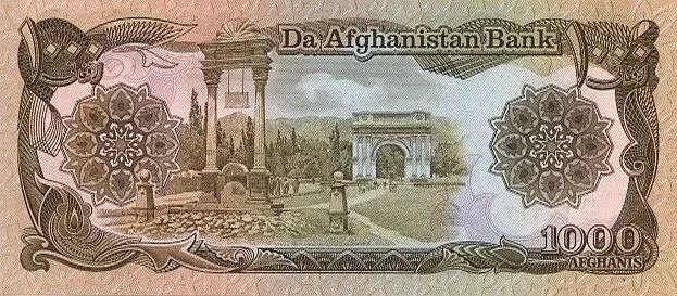 This Afghan banknote represents a face value of 1000 Afghanis. It was issued in 1979.