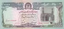 The 10,000 Afghanis banknote issued in 1993 by Afghanistan features an intricate and meaningful design. The obverse of the note depicts the Minaret of Jam, a UNESCO World Heritage site. This historical minaret, dating back to the 12th century, is an important symbol of Islamic architecture and Afghan history. The arch visible on the banknote is a traditional architectural element, often associated with Islamic art and architecture of the region.