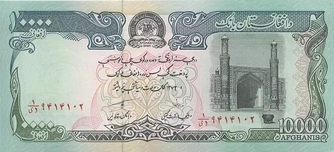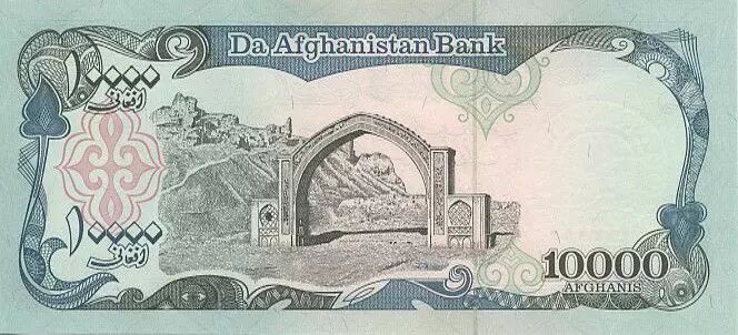 The 10,000 Afghan afghani banknote, issued in 1993, features distinct visual characteristics on both sides.