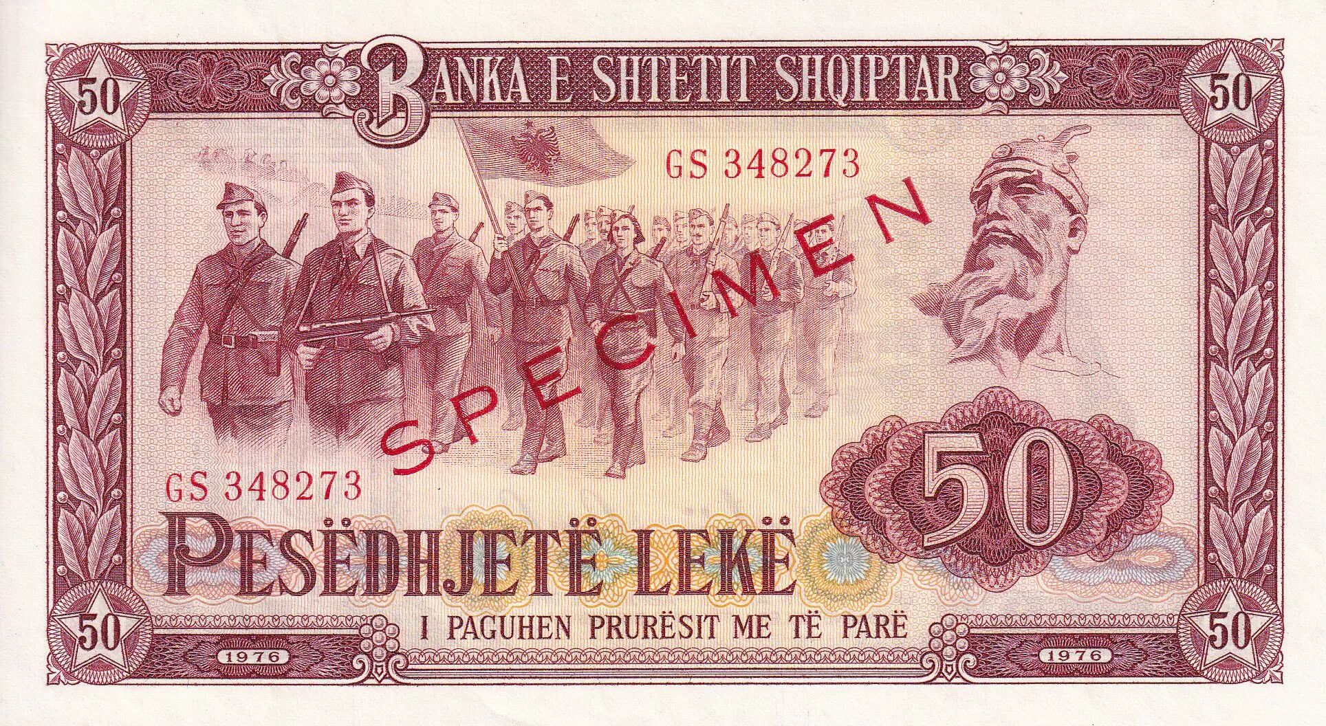 Banknote Albania 50 Lekë - Soldiers - Rifle and building - Specimen - 1976 - Serial GS - P.45s2