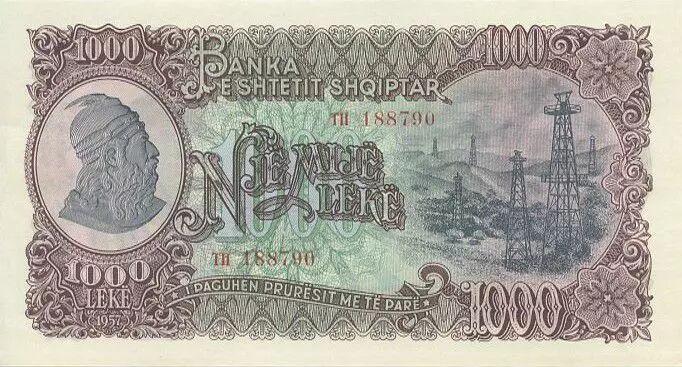 Ce billet de 1000 lekë de 1957 est un témoignage de l'histoire économique et industrielle de l'Albanie. Son design reflète l'importance des secteurs minier et pétrolier dans le développement du pays à cette période. Les symboles et les illustrations présents sur le billet incarnent les valeurs et les aspirations de la société albanaise de l'époque.