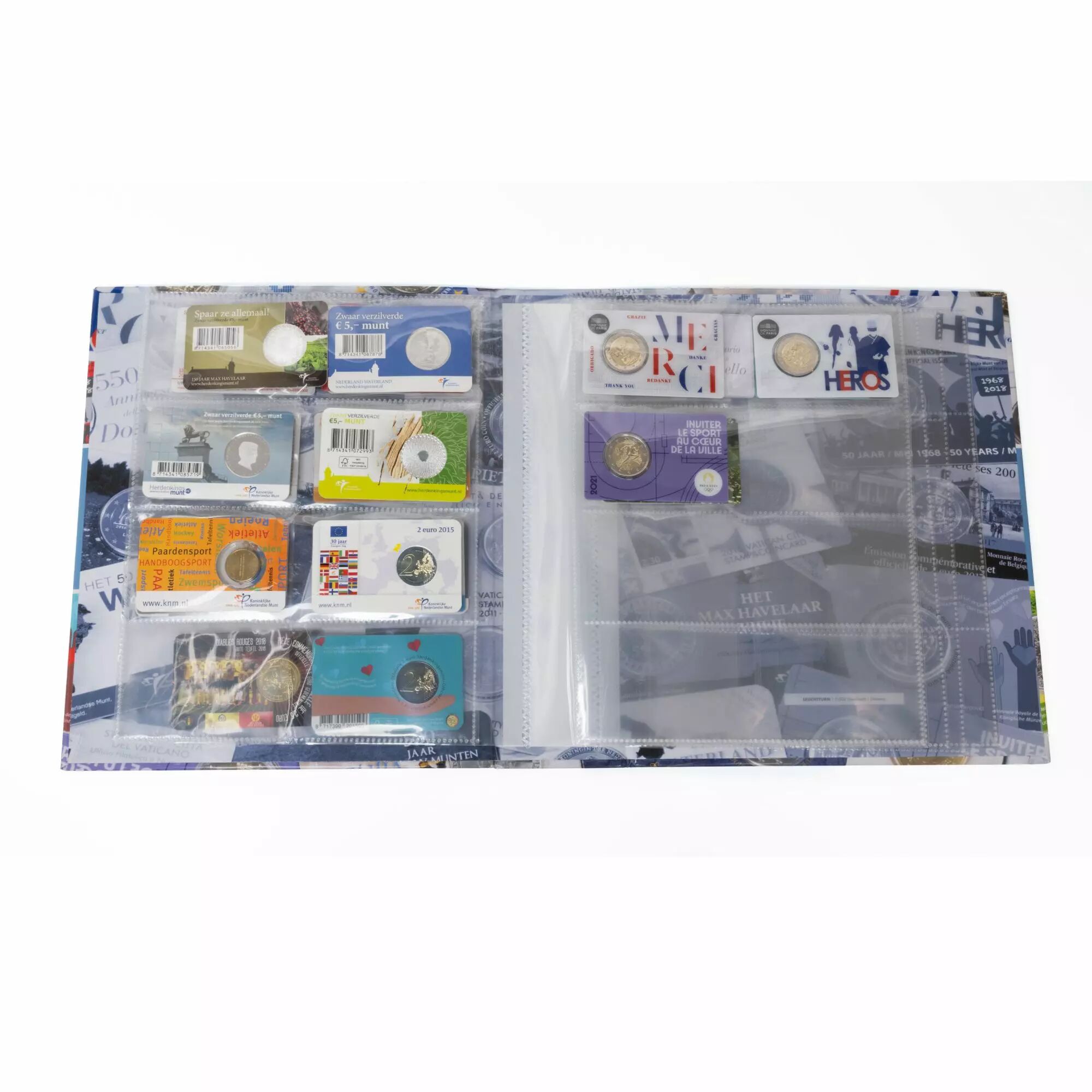 Album pour le classement de 80 coincards. Avec 10 feuilles solidement reliées contenant chacune 8 pochettes pour coincards. Feuilles transparentes en plastique sans acide. Pochettes chargeables par le haut, d'un format de 90 x 64 mm.