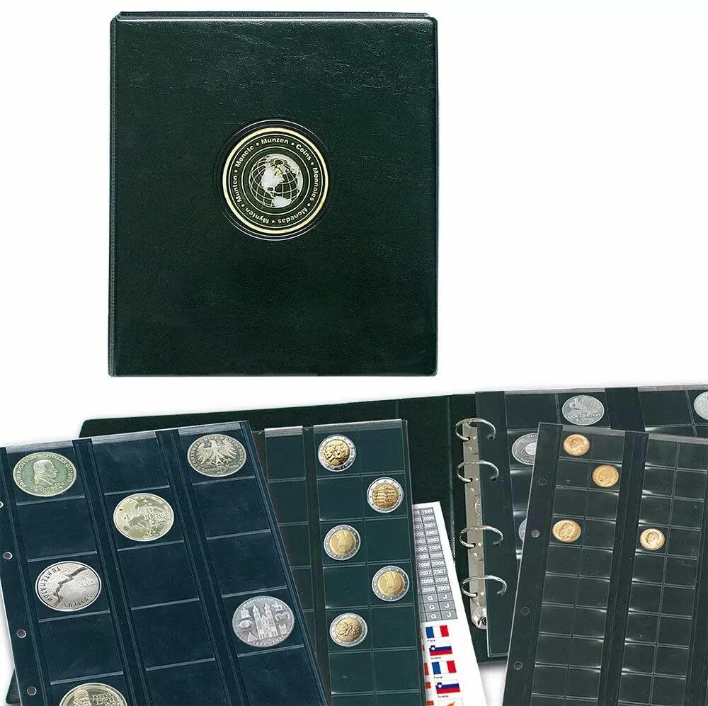 Un album numismatique de haute qualité pour monnaies de tous formats. Belle et solide reliure, coloris noire, avec disques décoratifs en métal gravé. Mécanique à 4 anneaux. Livré avec 4 feuilles transparentes à bandes coulissantes avec intercalaires noir (une de chaque réf. 4391-ID à 7394-ID) pour 134 pièces de diamètre variés. Livré avec une planche d'autocollants pour personnaliser la présentation : drapeaux, années, ateliers. Contenance totale : 10 feuilles.