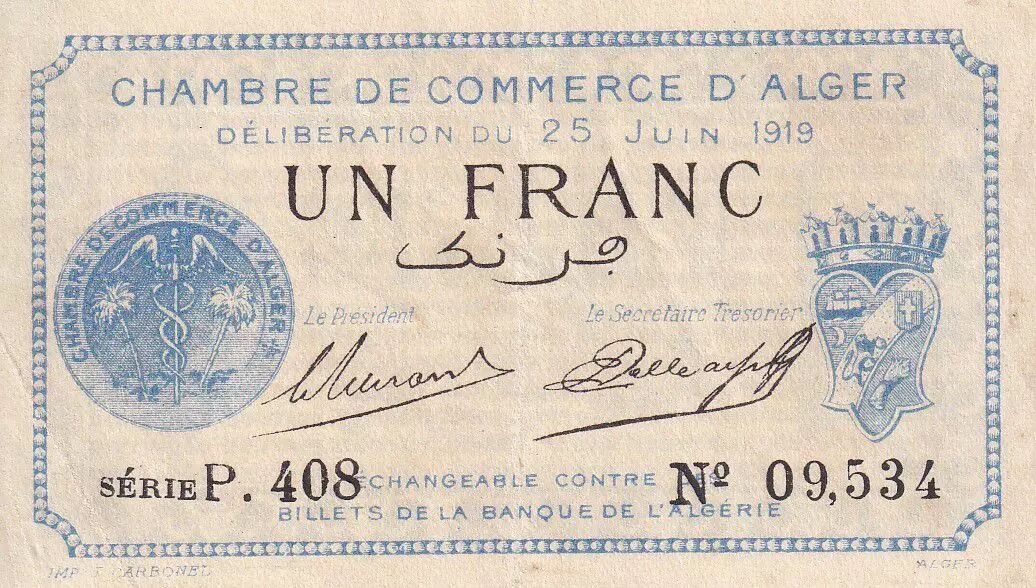 Home > > Algeria 1 Franc - Chambre de commerce of Alger - 1919 - Serial P.408 - P.137-12