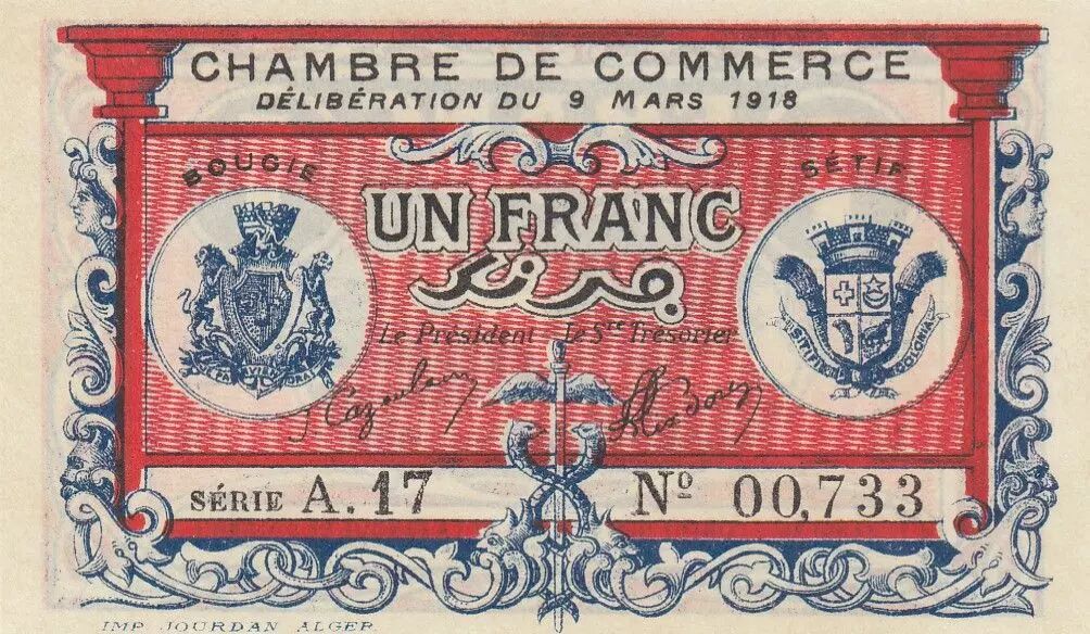 Banknote Algeria 1 Franc - Chambre de commerce of Bougie-Setif - 09-03-1918 - Serial A.17