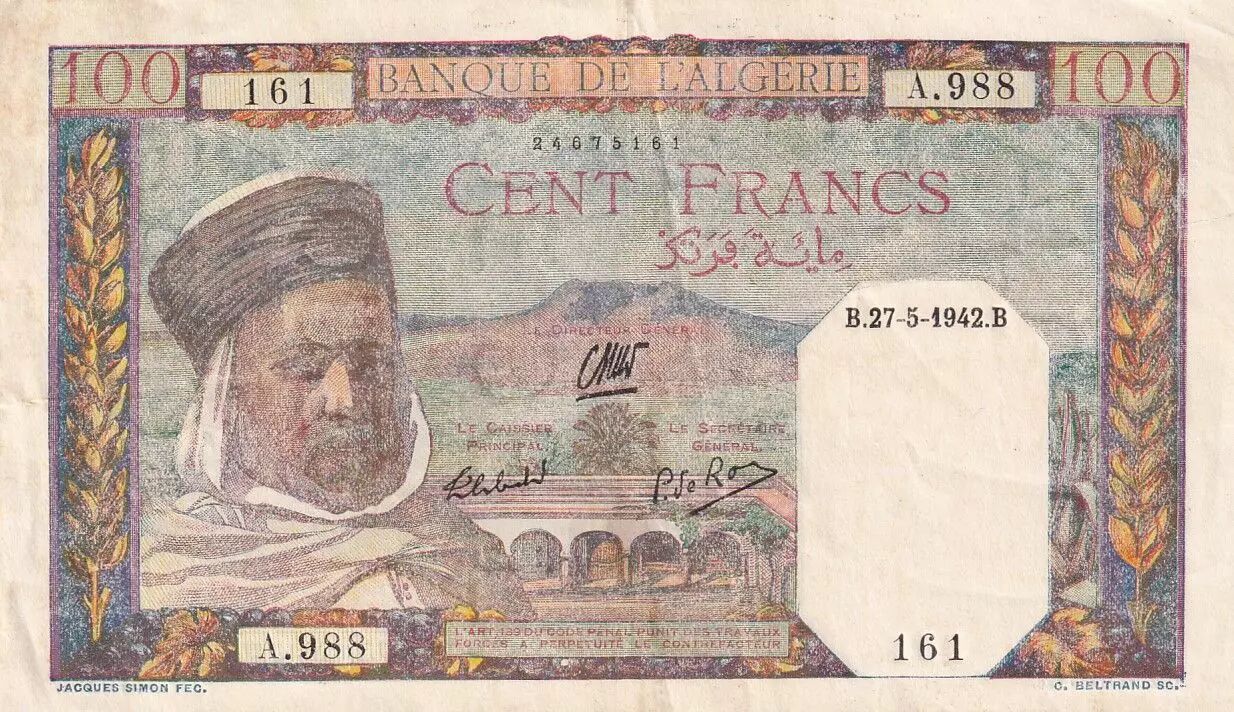 This banknote is an issue of Algeria, with a face value of 100 francs. It was issued in 1942 and is part of the A.988 series.