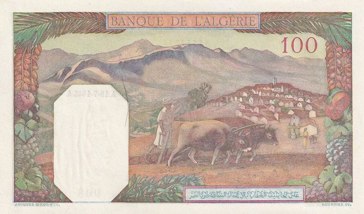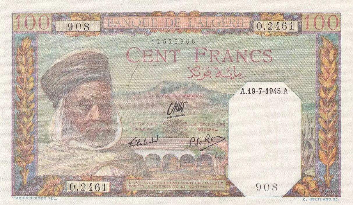 Banknote Algeria 100 Francs - Algerian with turban - Serial O.2461 - 1945 - UNC