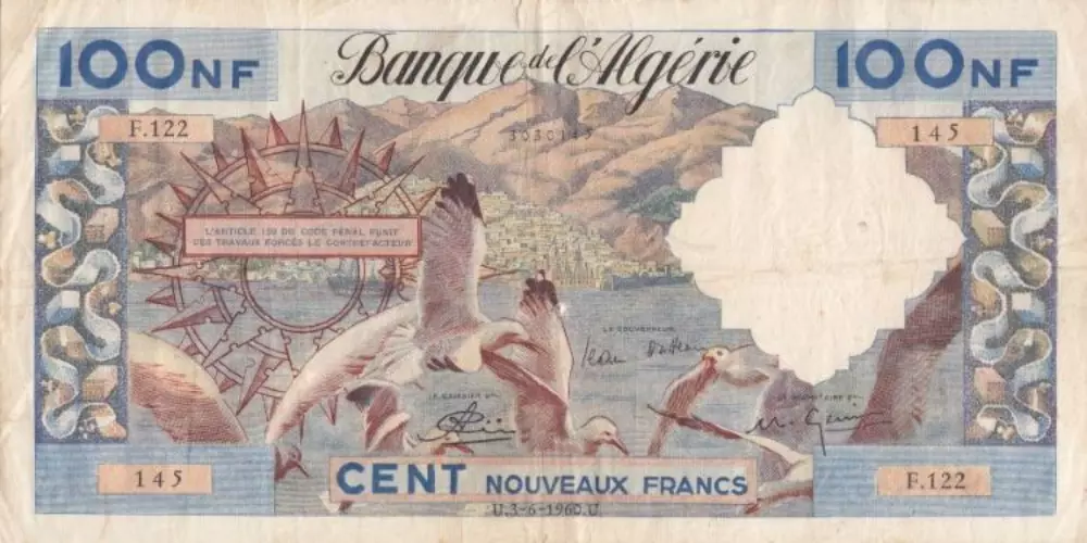 Home > World Banknotes > African Banknotes > Algeria > Algeria 100 NF - Seagulls - 03-06-1960- Serial F.122