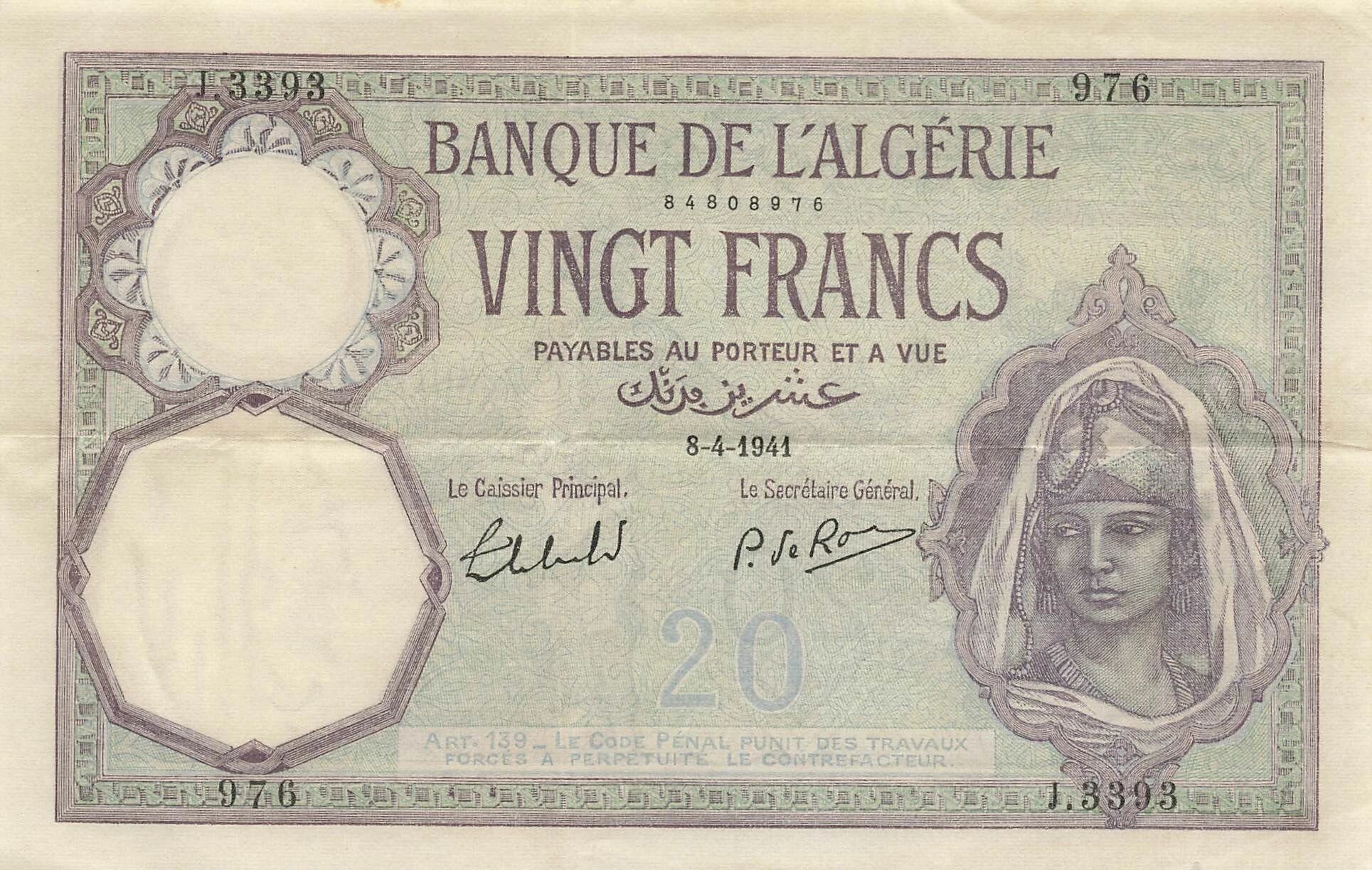 Home > World Banknotes > African Banknotes > Algeria > Algeria 20 Francs - Young Woman - 08-04-1941 - P.78c