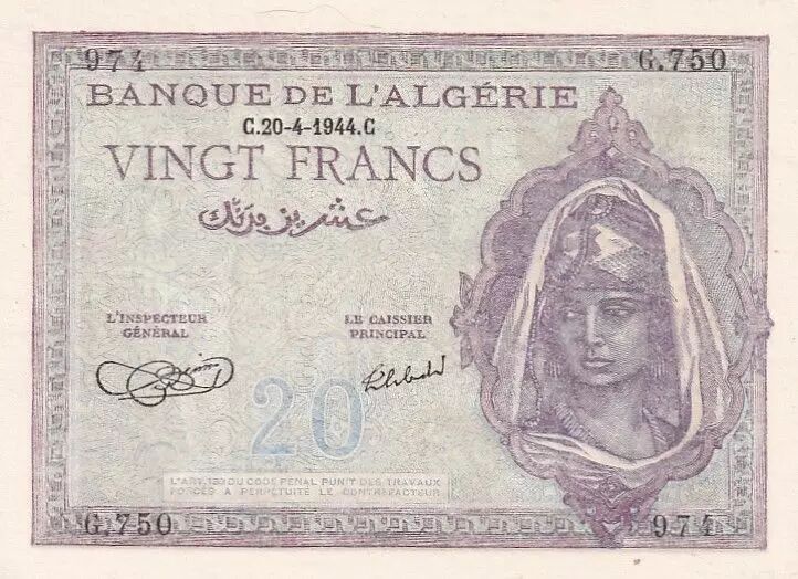Home > > Algeria 20 Francs - Young woman - 20-04-1944 - Serial G.750 - P.92a