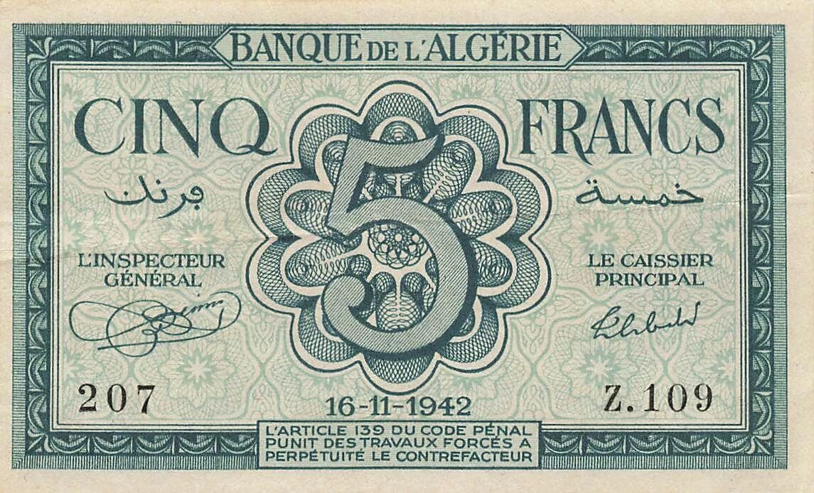 Home > World Banknotes > African Banknotes > Algeria > Algeria 5 Francs - 16-11-1942 - P.91