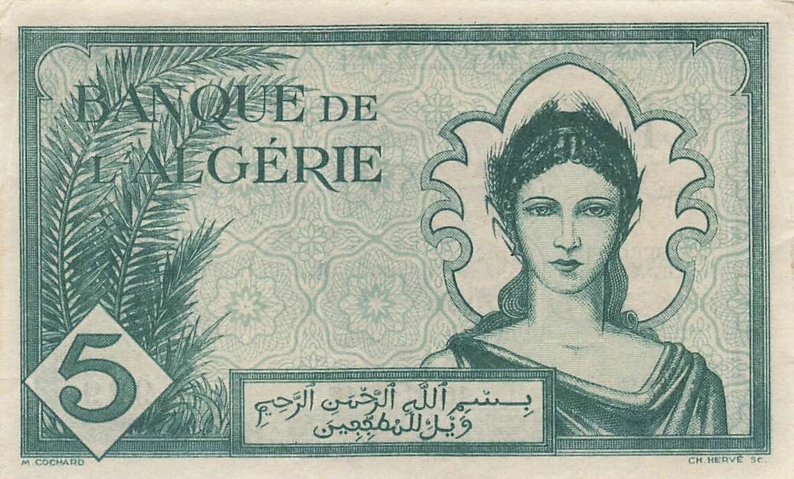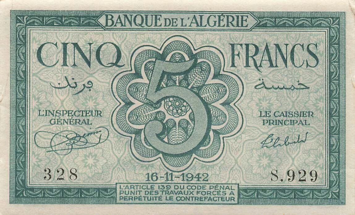 Home > World Banknotes > African Banknotes > Algeria > Algeria 5 Francs - 16-11-1942 - P.91