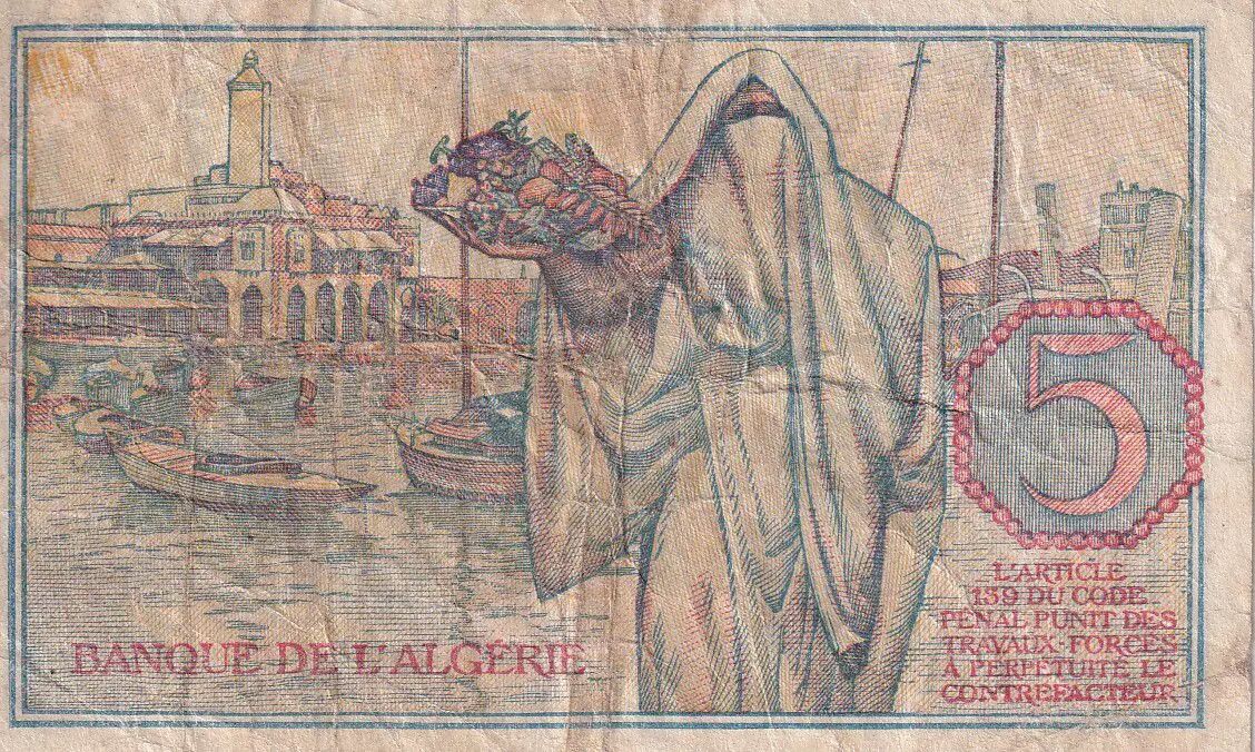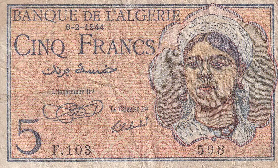 Banknote Algeria 5 Francs - Young girl - 08-02-1944 - Serial F.103 - P.94a