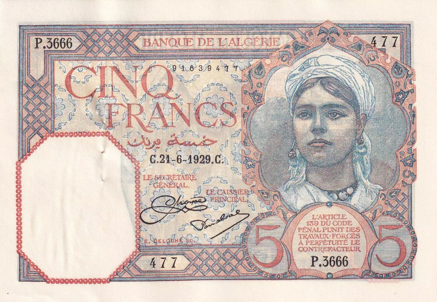 Home > World Banknotes > African Banknotes > Algeria > Algeria 5 Francs - Young girl - 21-06-1929 - Serial P.3666 - P.77a