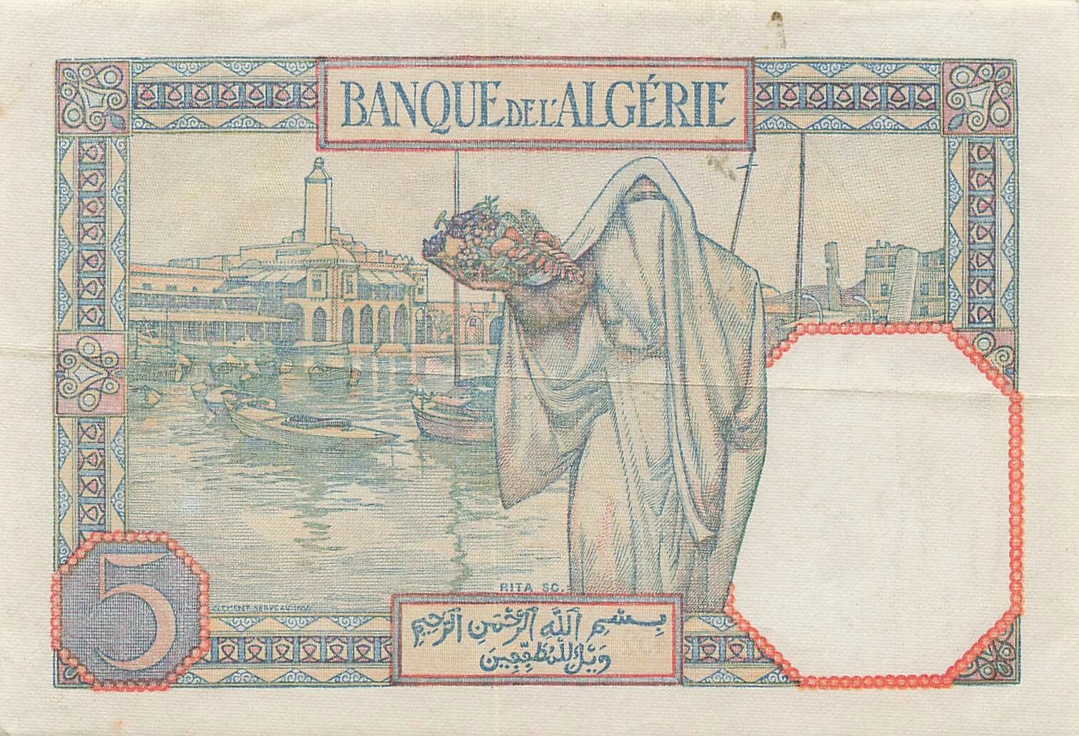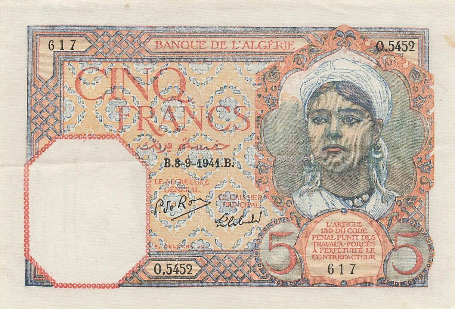 Banknote Algeria 5 Francs - Young Woman - 08-09-1941 - P.77b