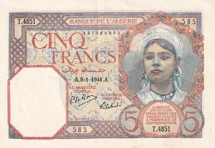 Home > > Algeria 5 Francs - Young woman - 09-01-1941 - Serial T.4851 - XF - P.77