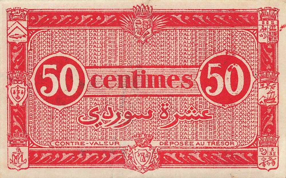 Home > World Banknotes > African Banknotes > Algeria > Algeria 50 Centimes - 31-01-1944 - Serial I - P.100