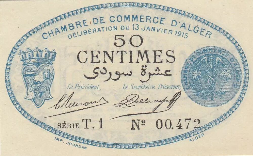 Home > > Algeria 50 Cents - Chambre de commerce of Alger - 13-01-1915 - Serial T.1