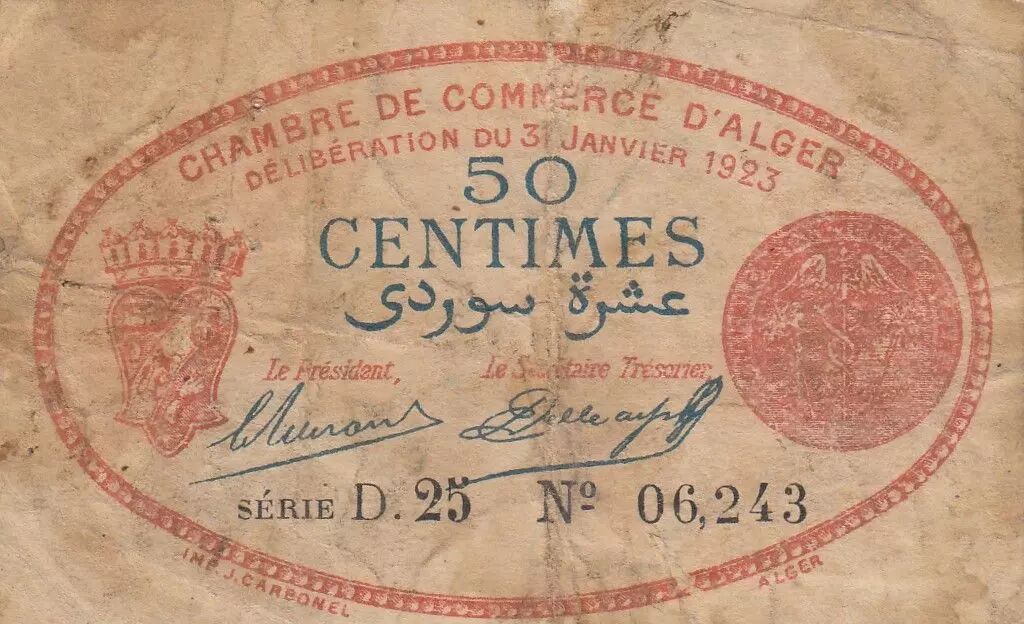 Banknote Algeria 50 Cents - Chambre de commerce of Alger - 31-01-1923 - Serial D.25