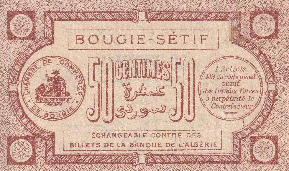 Home > > Algeria 50 Cents - Chambre de commerce of Bougie-Setif - 1915 - Serial 65 - P.139.1