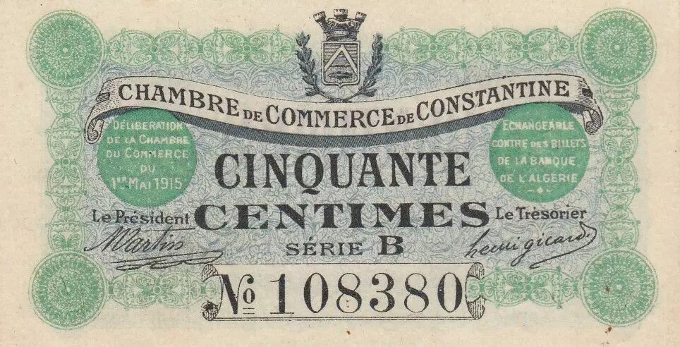 Home > World Banknotes > African Banknotes > Algeria > Algeria 50 Cents - Chambre de commerce of Constantine - 01-05-1915 - Serial B