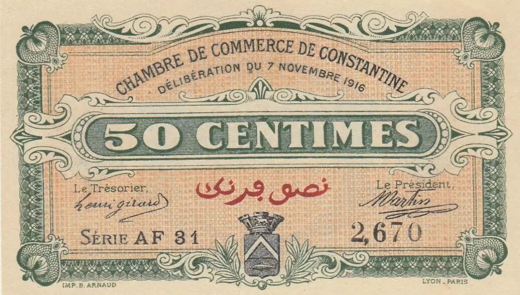 Home > > Algeria 50 Cents - Chambre de commerce of Constantine - 07-11-1916 - Serial AF.31