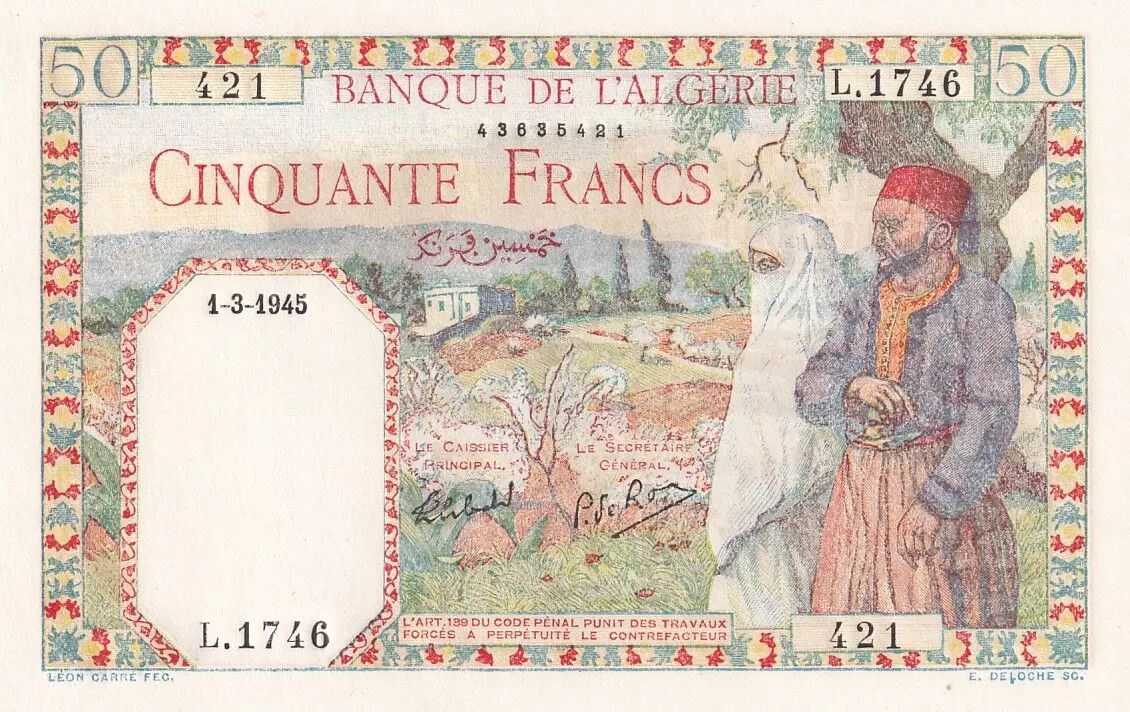 Banknote Algeria 50 Francs - Couple - Letter Watermark - 01-03-1945 - Serial L.1746
