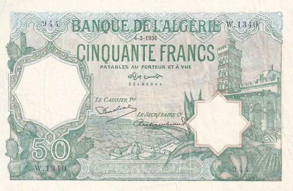 Banknote Algeria 50 Francs - Mosque - 04-03-1936 - Serial W.1340 - P.80