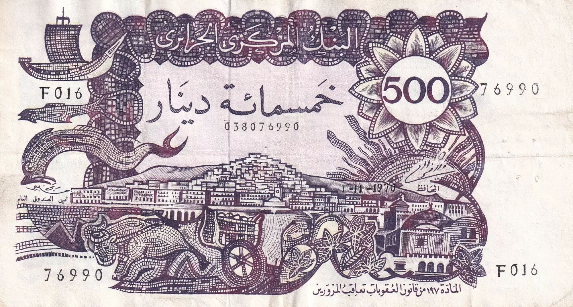 Banknote Algeria 500 Dinars - View of the city - Galleon and fortress - 1970 - Serial F.016 - P.129