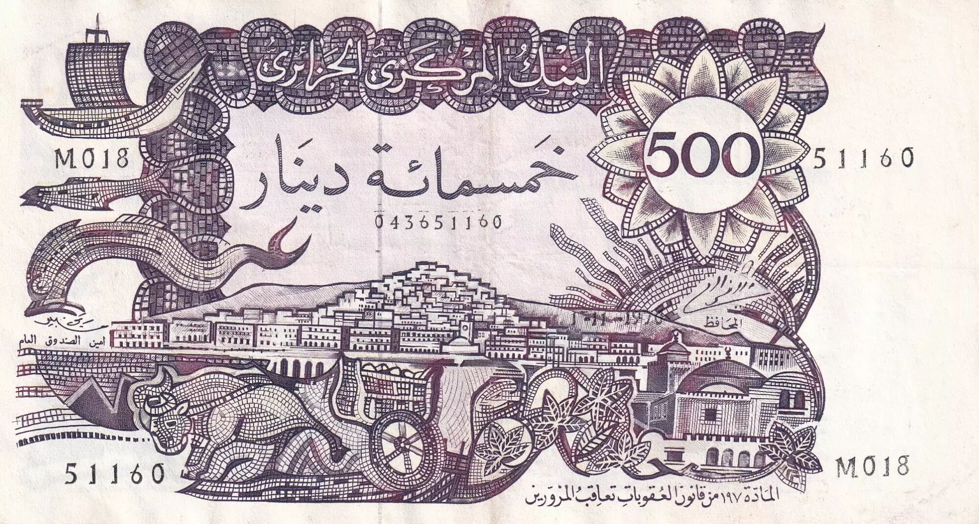 Banknote Algeria 500 Dinars - View of the city - Galleon and fortress - 1970 - Serial M.018 - P.129