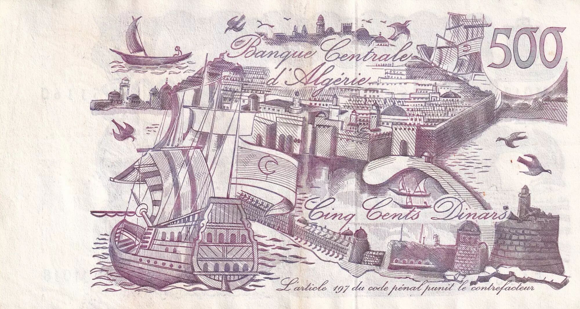 Home > World Banknotes > African Banknotes > Algeria > Algeria 500 Dinars - View of the city - Galleon and fortress - 1970 - Serial M.018 - P.129