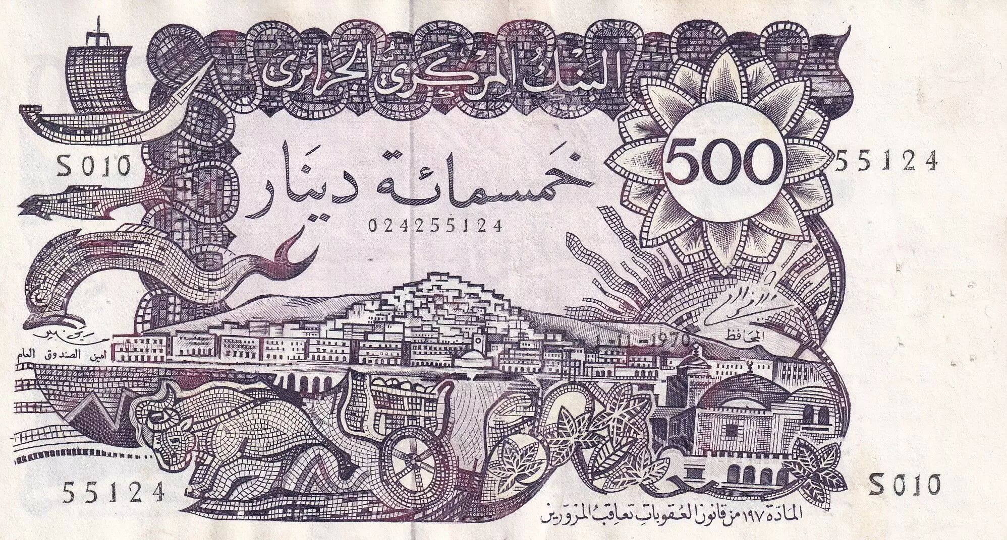 Banknote Algeria 500 Dinars - View of the city - Galleon and fortress - 1970 - Serial S.010 - P.129