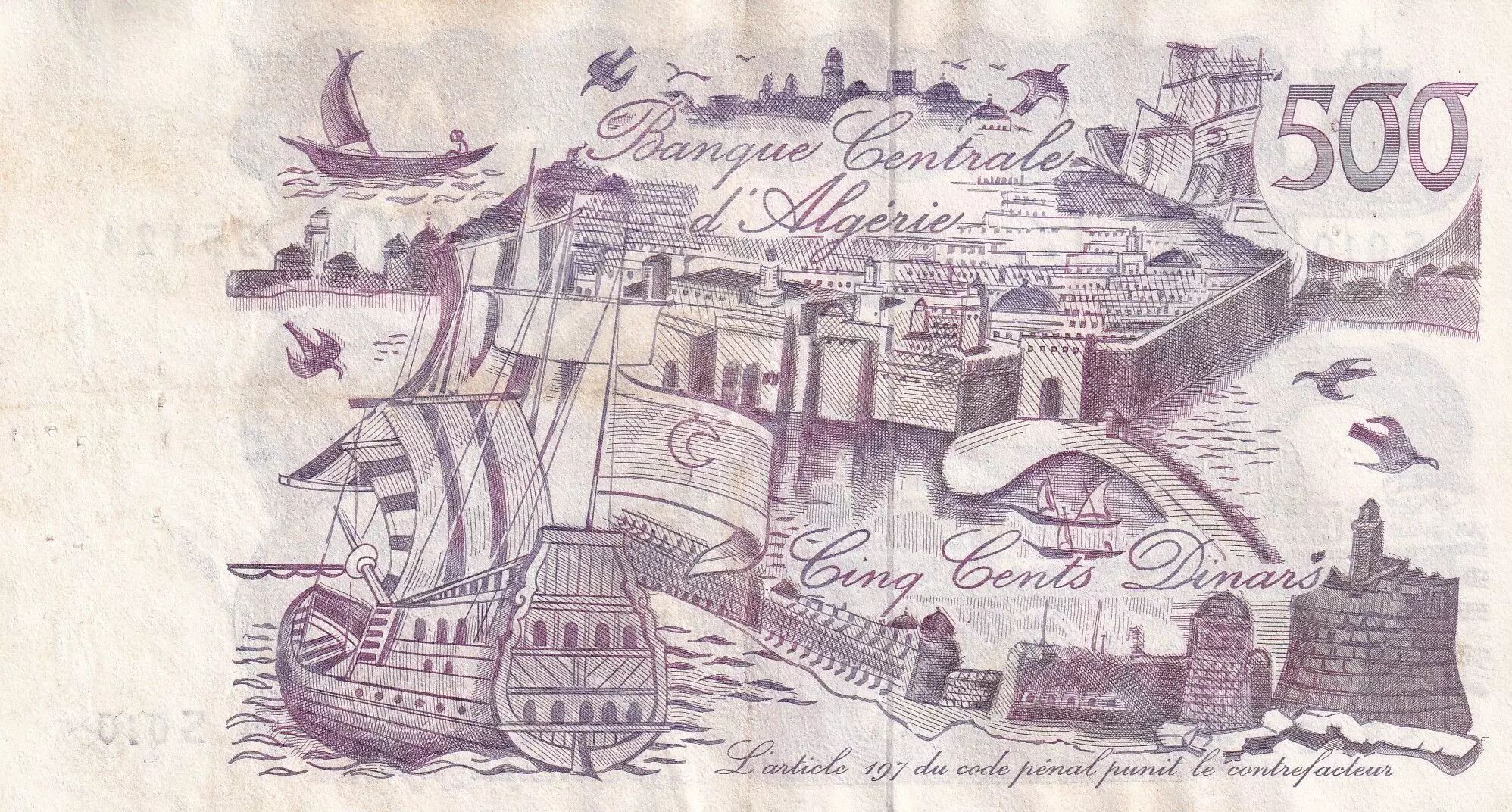 Home > World Banknotes > African Banknotes > Algeria > Algeria 500 Dinars - View of the city - Galleon and fortress - 1970 - Serial S.010 - P.129