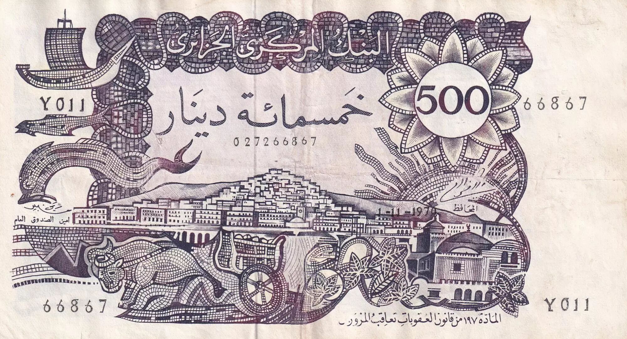 Banknote Algeria 500 Dinars - View of the city - Galleon and fortress - 1970 - Serial Y.011