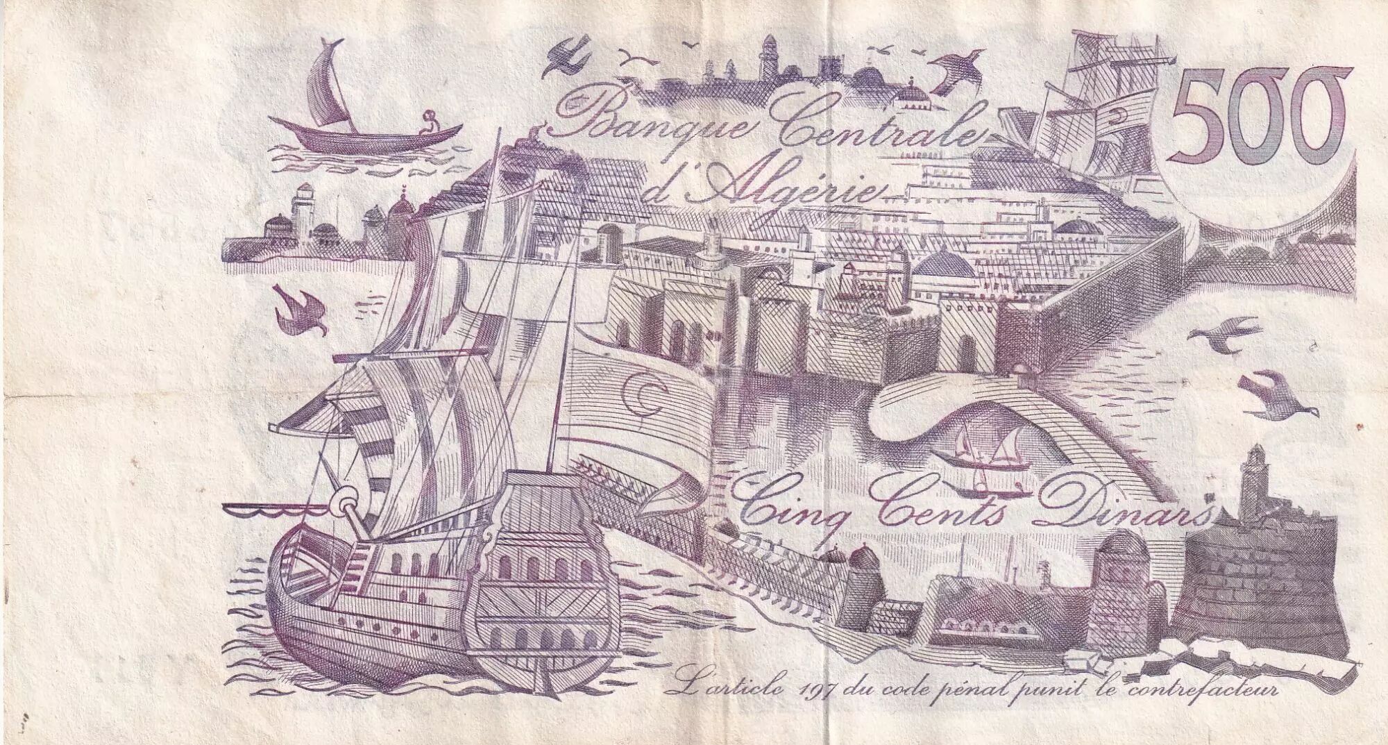 Home > World Banknotes > African Banknotes > Algeria > Algeria 500 Dinars - View of the city - Galleon and fortress - 1970 - Serial Y.011