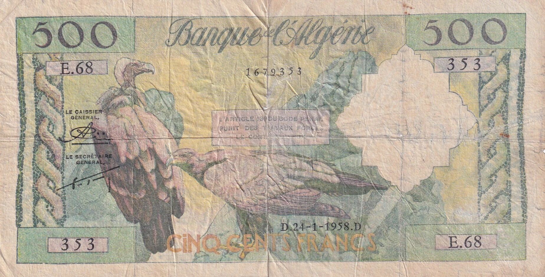 This 500 Francs banknote, issued in Algeria, dates from January 24, 1958 and belongs to the E.68 series. Its dimensions are 160 mm in length and 84 mm in width. The weight of this banknote is 1 gram.