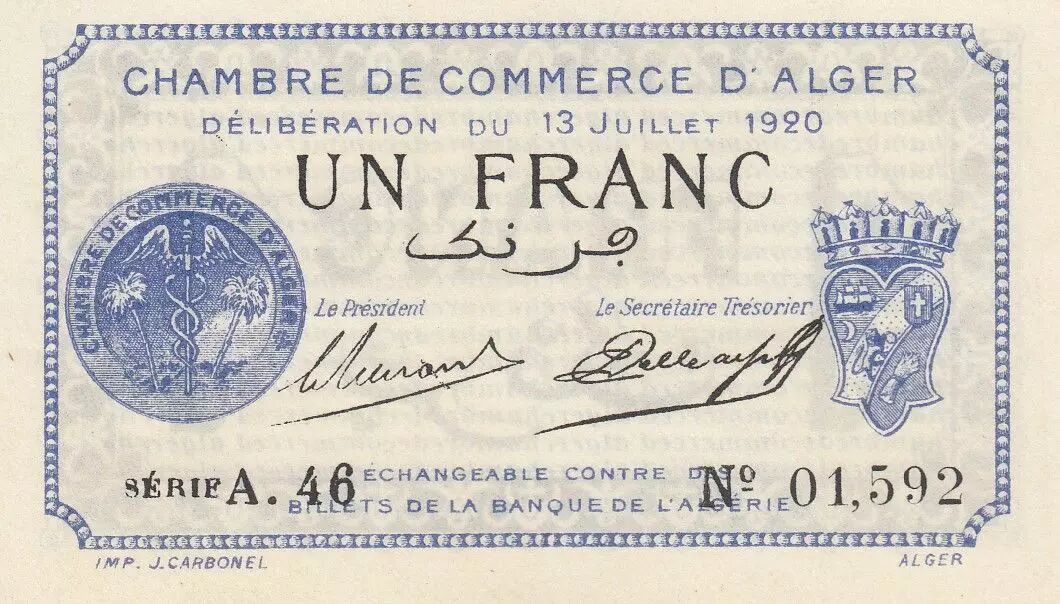 Billet Algérie 1 Franc - Chambre de commerce d'Alger - 13-07-1920 - Série A.46