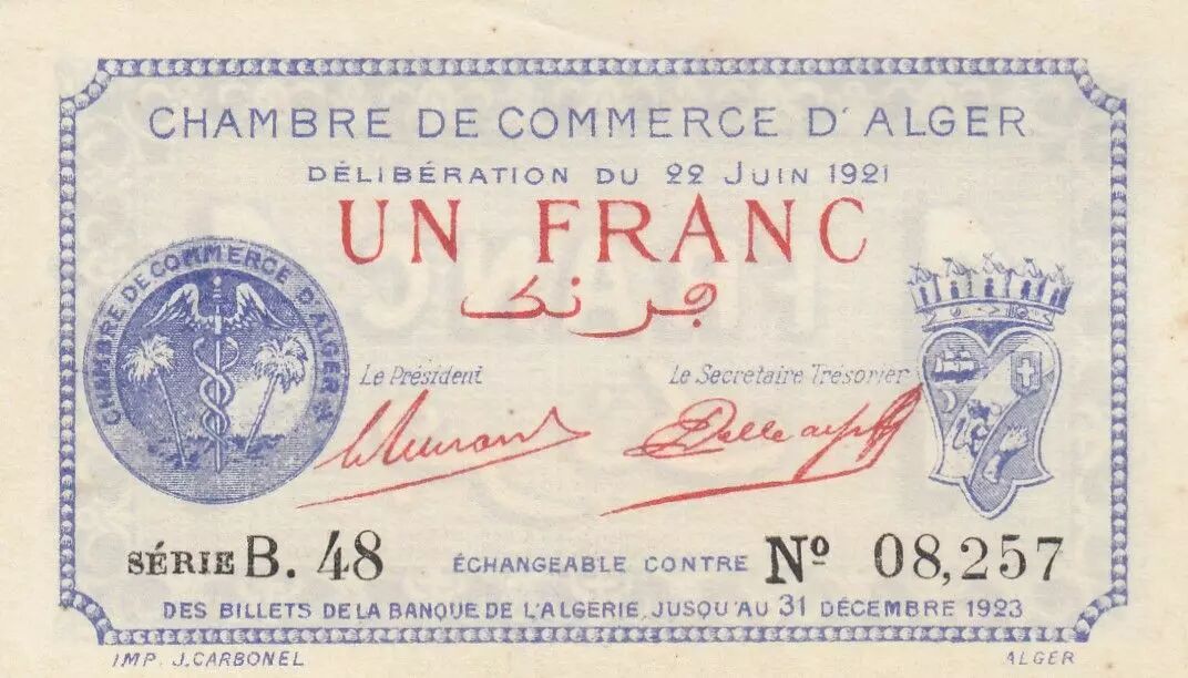 Billet Algérie 1 Franc - Chambre de commerce d'Alger - 22-06-1921 - Série B.48