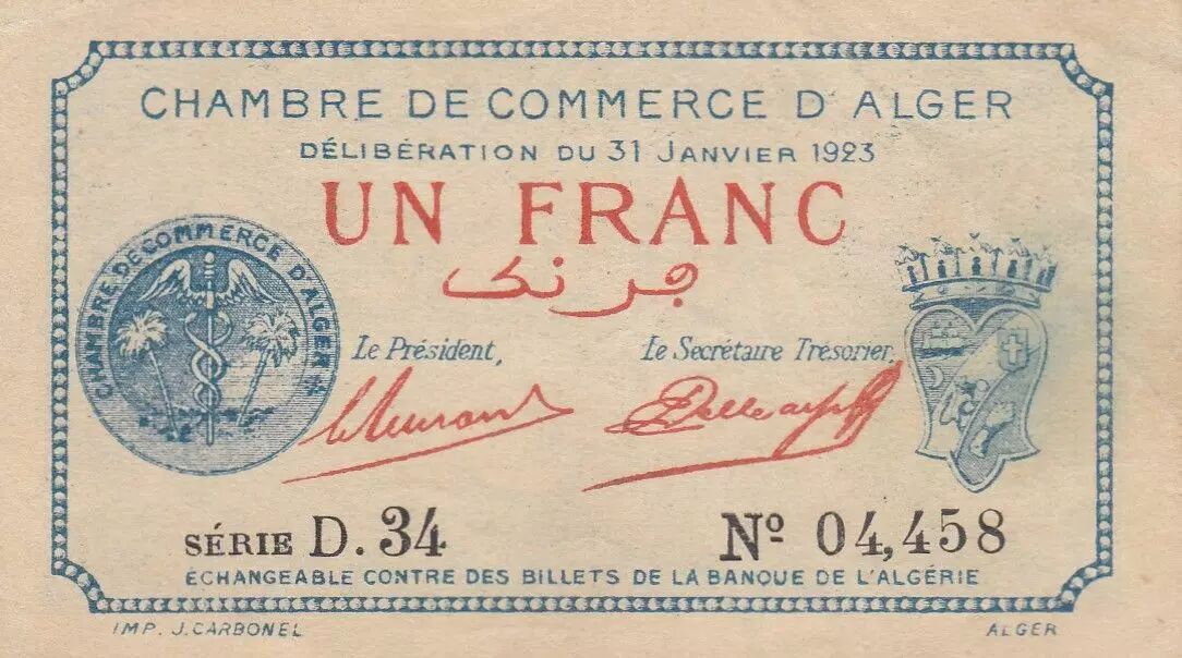 Billet Algérie 1 Franc - Chambre de commerce d'Alger - 31-01-1923 - Série D.34