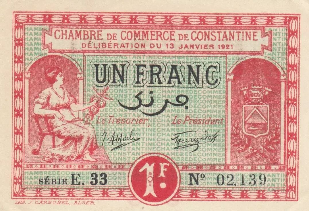 Billet Algérie 1 Franc - Chambre de commerce de Constantine - 13-01-1921 - Série E.33